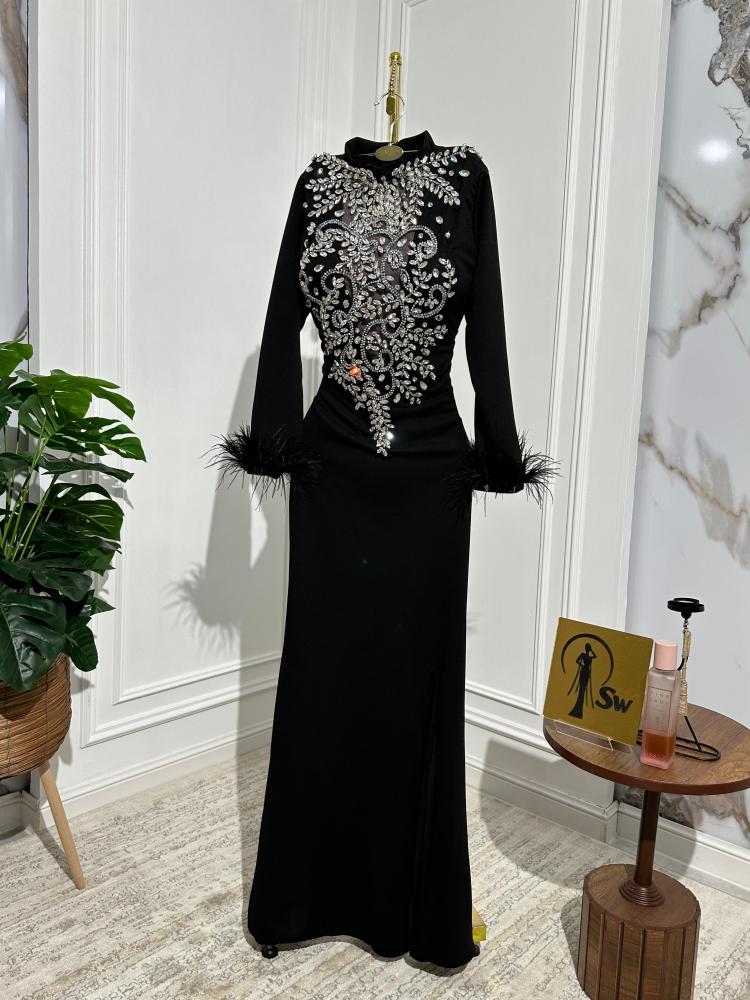 الخامه كريب استرتش +تطريز يدوي فصوص زيركون+اكمام ريش