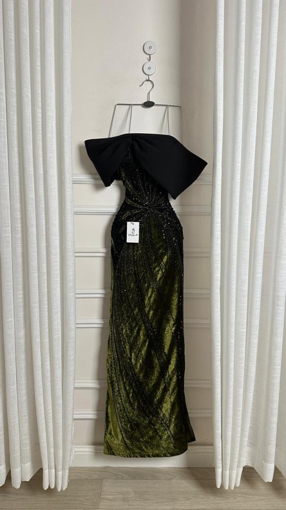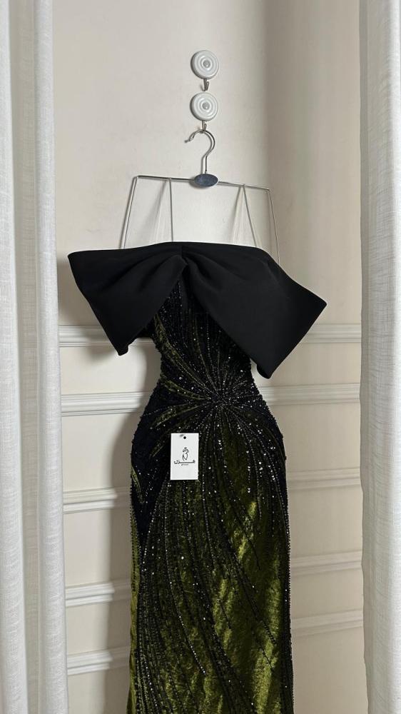 فستان سهرة فاخر يجمع بين القطيفة الفخمة والتل المطرز بالخرز والشك اليدوي بتصميم يغيض أنوثة وتميڙا بأتى بقصة توب سكينى تبرز القوام برق، ناعم يضفى لمسة انسيابية أنيقة الألوان أخضر على أسود تمنح الفستان طابغا درامتا فخقا يعكس الثقة والجاذبية لطول loo سم، والسعر 610 ريال.