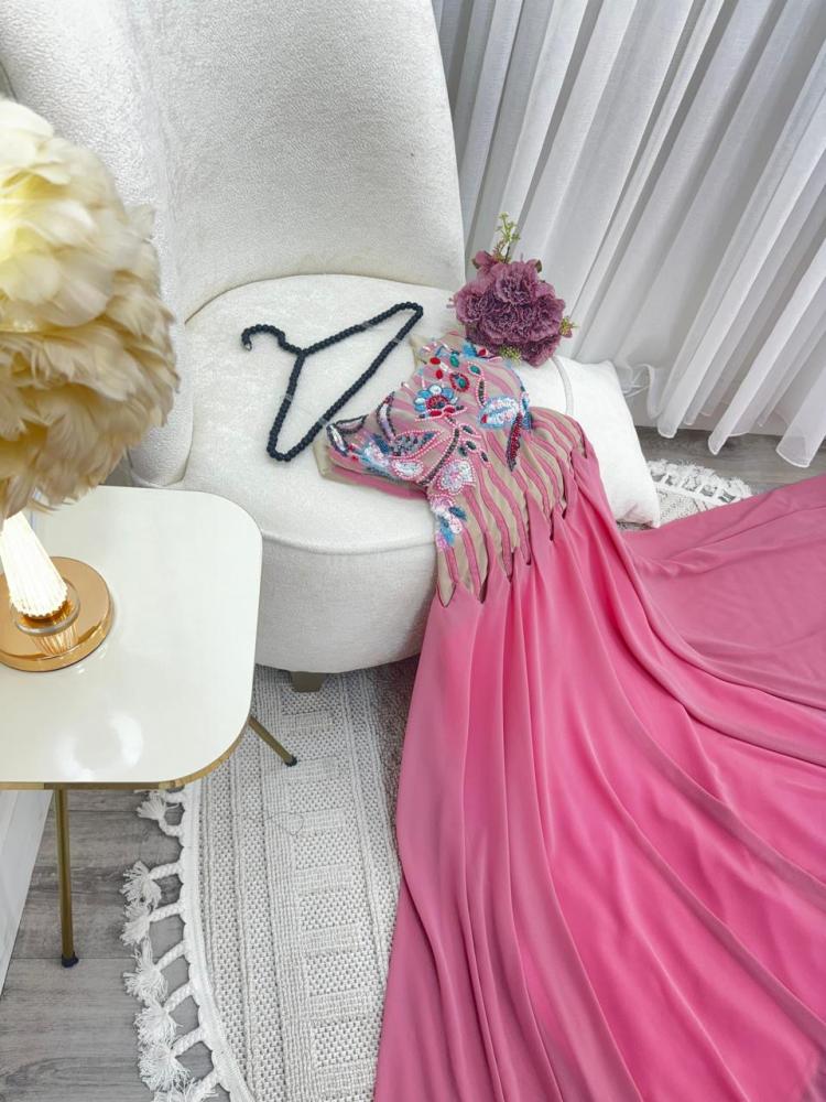 الخامة : جورجيت بدبل كلوش مبطن بتفته - الصدر تطريز يدوي خرز مع بطانه كريب